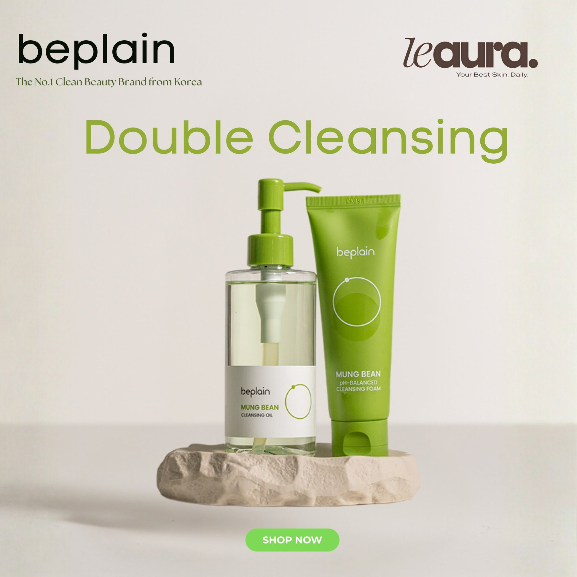 Beplain Double Cleansing Bundle, featuring the Beplain Oil Cleanser and Beplain Mung Bean Foam Cleanser. This powerful duo is designed to remove every trace of makeup, sunscreen, dirt, and excess oil, while keeping your skin barrier healthy and hydrated.