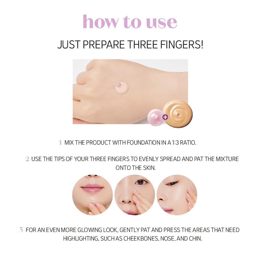 استخدميه بروحه كـ highlighter ناعم، أو اخلطيه مع الفاونديشن لتأثير “زجاج البشرة” اللي الكل يدور عليه. مناسب للبشرة الجافة أو الباهتة اللي تحتاج ترطيب ولمعة فورية.